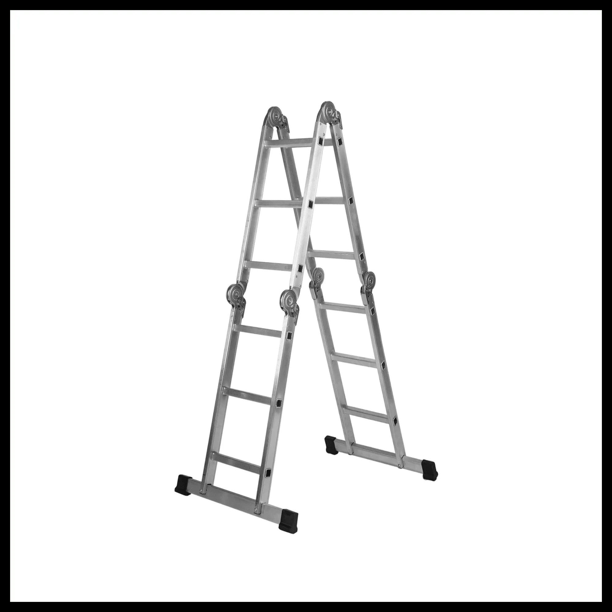 Escalera multifunción de aluminio 4x3 peldaños con bloqueo automático, barra estabilizadora y pies antideslizantes. Ideal para uso profesional. Estructura de aluminio resistente y ligera. Juntas con cierre automático para mayor seguridad. Uso versátil: en A, extendida o como andamio. Barra estabilizadora para mayor firmeza. Pies antideslizantes para mejor agarre. Cumple con la norma EN 131. Ideal para profesionales de construcción y mantenimiento.