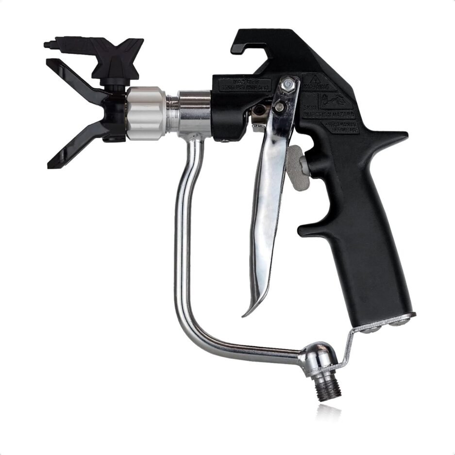 Pistola Pintar Airless 310 BAR Presión máxima de 310 bar Equipo de airless necesario de 1 hp Cuerpo de aluminio Agarre ergonómico antideslizante Mango con protector de puño Compatible con RAC-XHD de Graco Incluye portaboquillas Incluye boquillla 643 Apto para barnices, lacas, esmaltes, imprimaciones, pinturas de poliuretano, pinturas acrílicas, pinturas plásticas, pinturas de caucho acrílico, pinturas al látex, temples, revestimientos de tejados, pinturas anticorrosivas, películas gruesas y masillas
